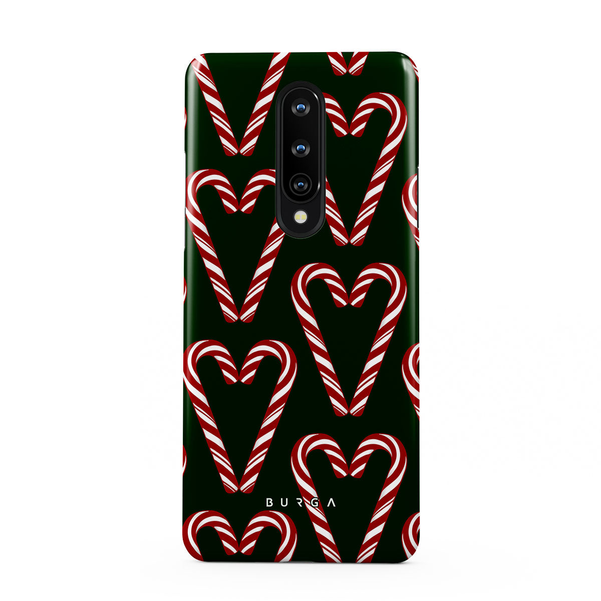 Vibrant and playful, our Candy Cane OnePlus 8 Case phone case design showcases candy cane heart motifs against a dark green background—a delightful choice for those who love a touch of whimsy and nostalgia.