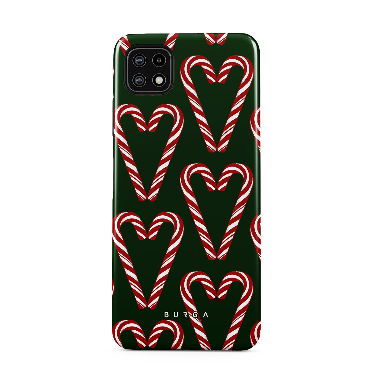 Vibrant and playful, our Candy Cane Samsung Galaxy A22 5G Case phone case design showcases candy cane heart motifs against a dark green background—a delightful choice for those who love a touch of whimsy and nostalgia.
