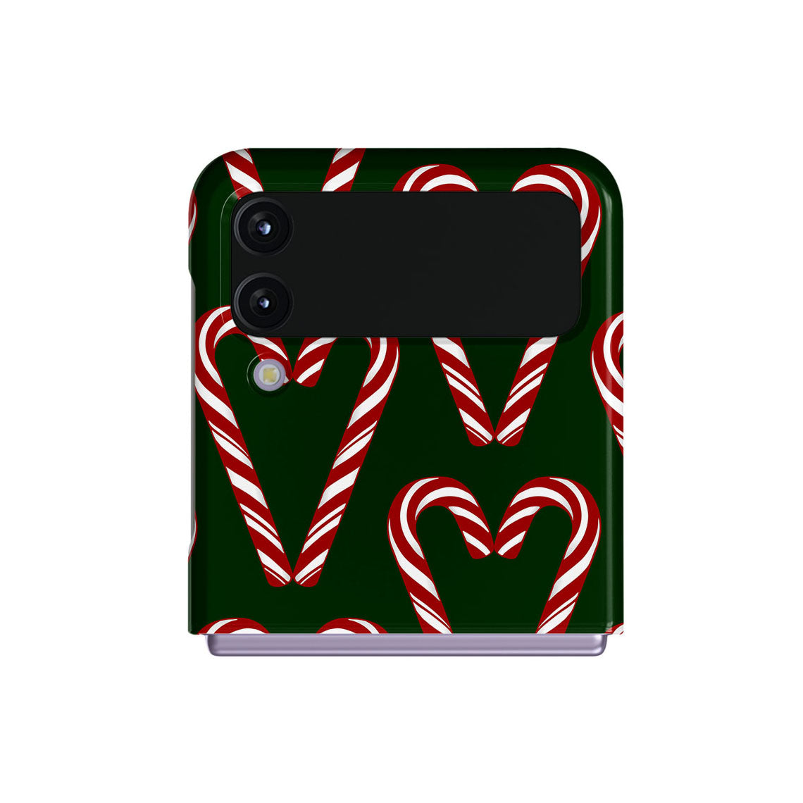 Vibrant and playful, our Candy Cane Samsung Galaxy Z Flip 4 Case phone case design showcases candy cane heart motifs against a dark green background—a delightful choice for those who love a touch of whimsy and nostalgia.