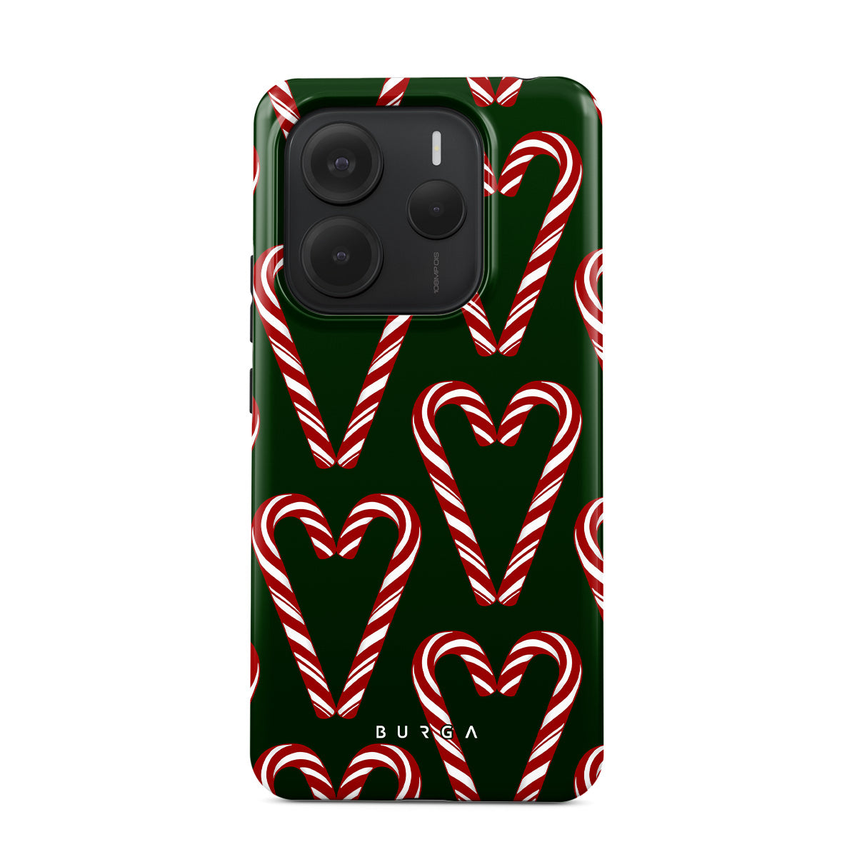 Vibrant and playful, our Candy Cane Xiaomi Redmi Note 14 5G Case phone case design showcases candy cane heart motifs against a dark green background—a delightful choice for those who love a touch of whimsy and nostalgia.