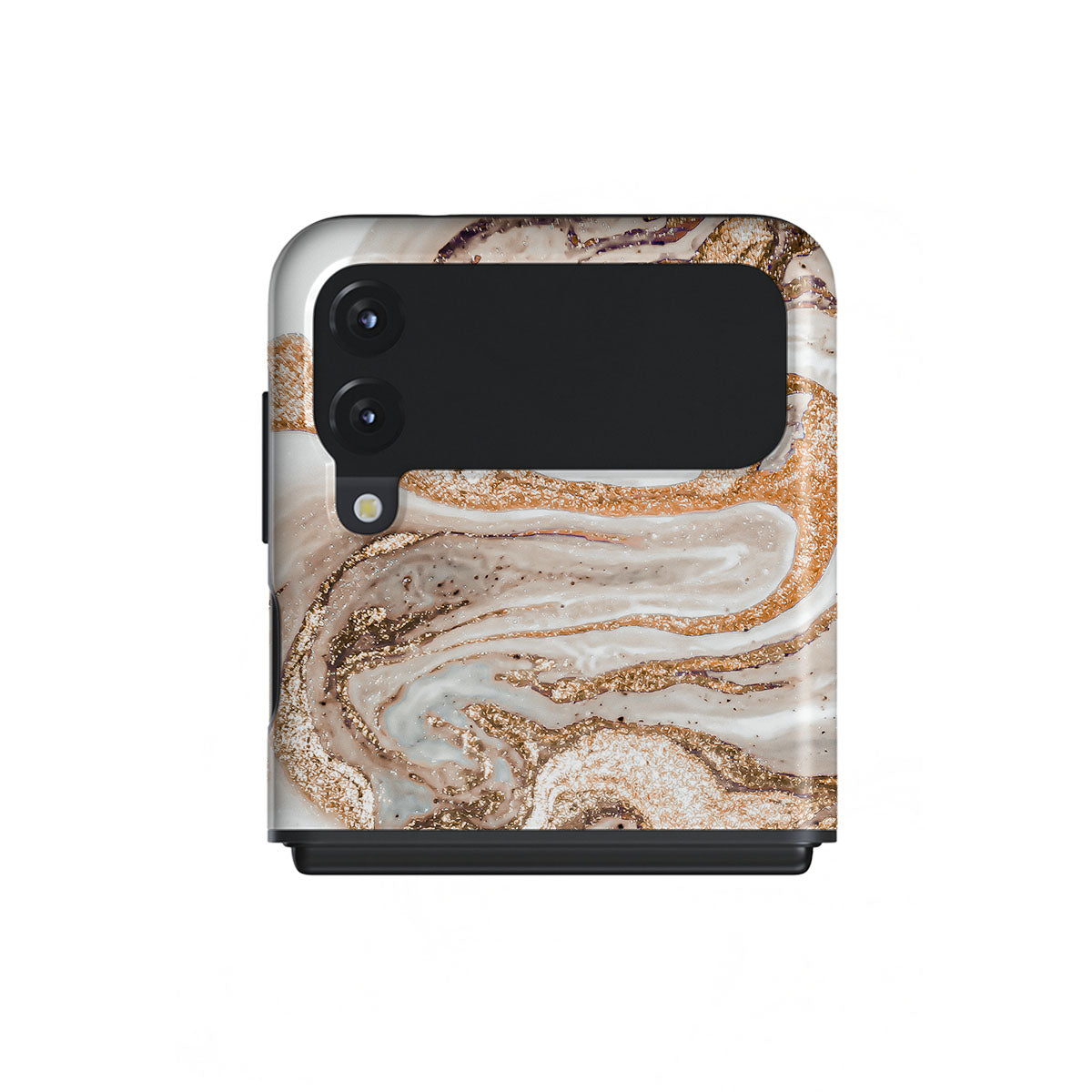 Our enchanting Cappuccino Samsung Galaxy Z Flip 3 phone case showcases a sophisticated and creamy marble pattern with golden swirls in it. The marble dream radiates elegance and luxury and is guaranteed to add some to your style.