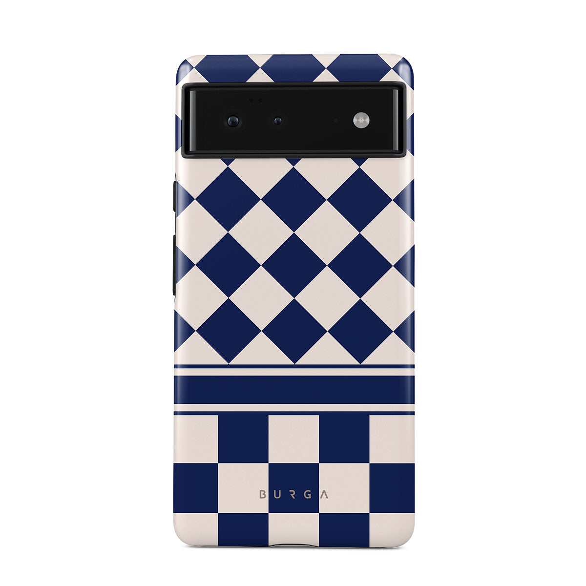 Embrace the essence of subtle luxury with our Check & Mate Google Pixel 6 Pro phone case design. Blending eggshell and deep blue checkers, it evokes whispers of elegance. While diamonds grace the upper half, the lower half features a timeless chessboard pattern.