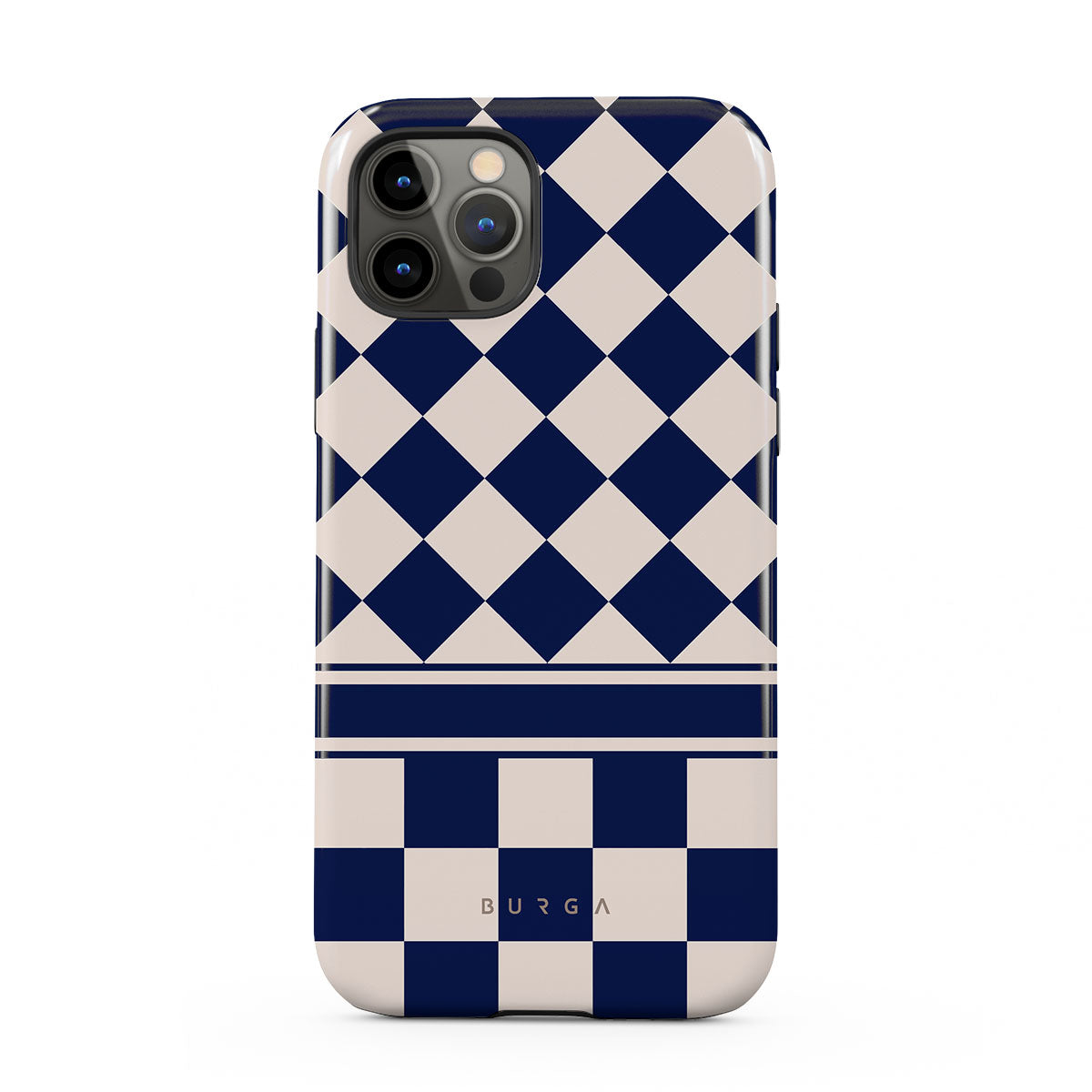 Embrace the essence of subtle luxury with our Check & Mate iPhone 12 Pro phone case design. Blending eggshell and deep blue checkers, it evokes whispers of elegance. While diamonds grace the upper half, the lower half features a timeless chessboard pattern.