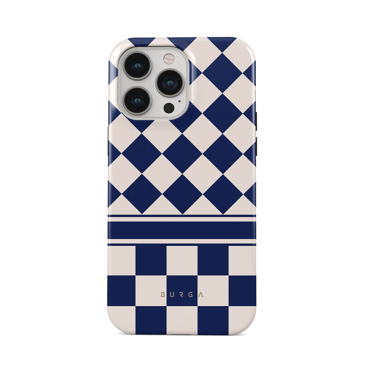Embrace the essence of subtle luxury with our Check & Mate iPhone 13 Pro phone case design. Blending eggshell and deep blue checkers, it evokes whispers of elegance. While diamonds grace the upper half, the lower half features a timeless chessboard pattern.