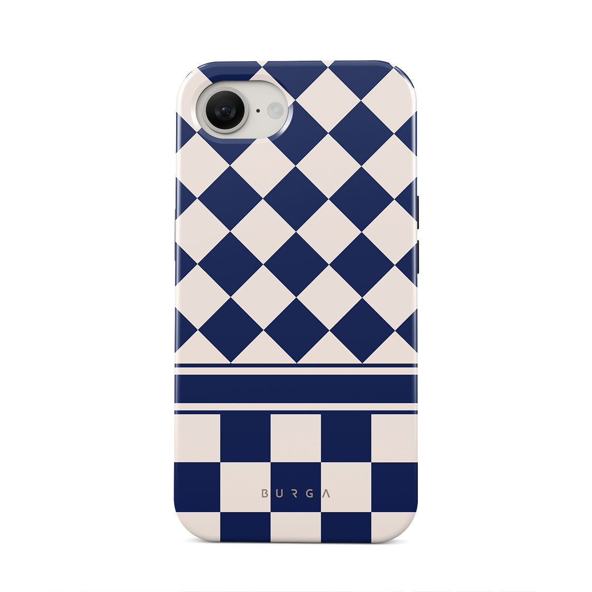 Embrace the essence of subtle luxury with our Check & Mate iPhone 16e phone case design. Blending eggshell and deep blue checkers, it evokes whispers of elegance. While diamonds grace the upper half, the lower half features a timeless chessboard pattern.