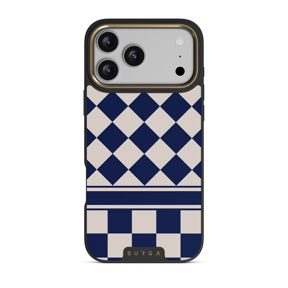 Embrace the essence of subtle luxury with our Check & Mate iPhone 17 Pro Max phone case design. Blending eggshell and deep blue checkers, it evokes whispers of elegance. While diamonds grace the upper half, the lower half features a timeless chessboard pattern.