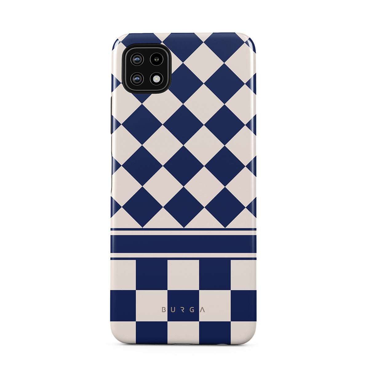 Embrace the essence of subtle luxury with our Check & Mate Samsung Galaxy A22 5G phone case design. Blending eggshell and deep blue checkers, it evokes whispers of elegance. While diamonds grace the upper half, the lower half features a timeless chessboard pattern.