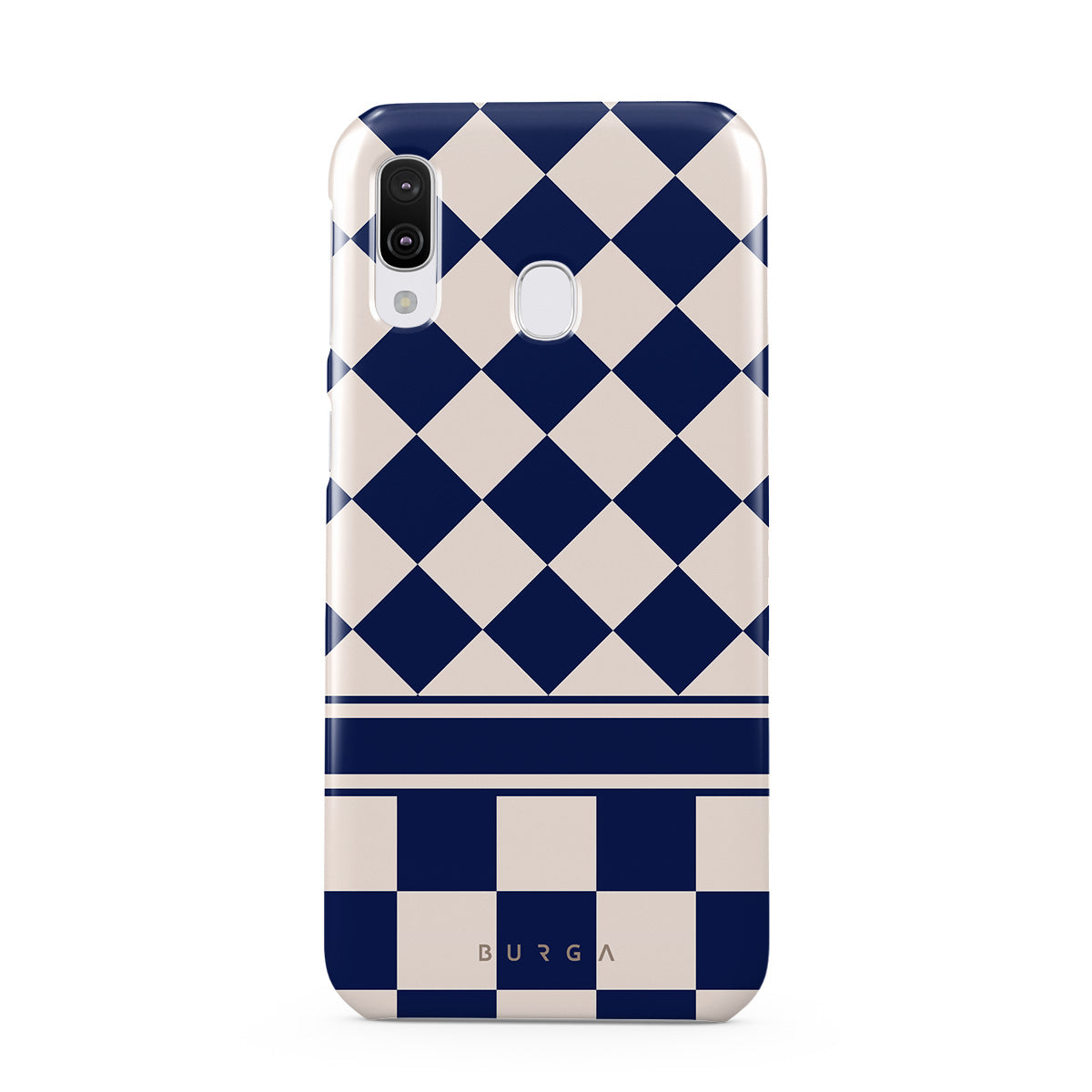Embrace the essence of subtle luxury with our Check & Mate Samsung Galaxy A40 phone case design. Blending eggshell and deep blue checkers, it evokes whispers of elegance. While diamonds grace the upper half, the lower half features a timeless chessboard pattern.