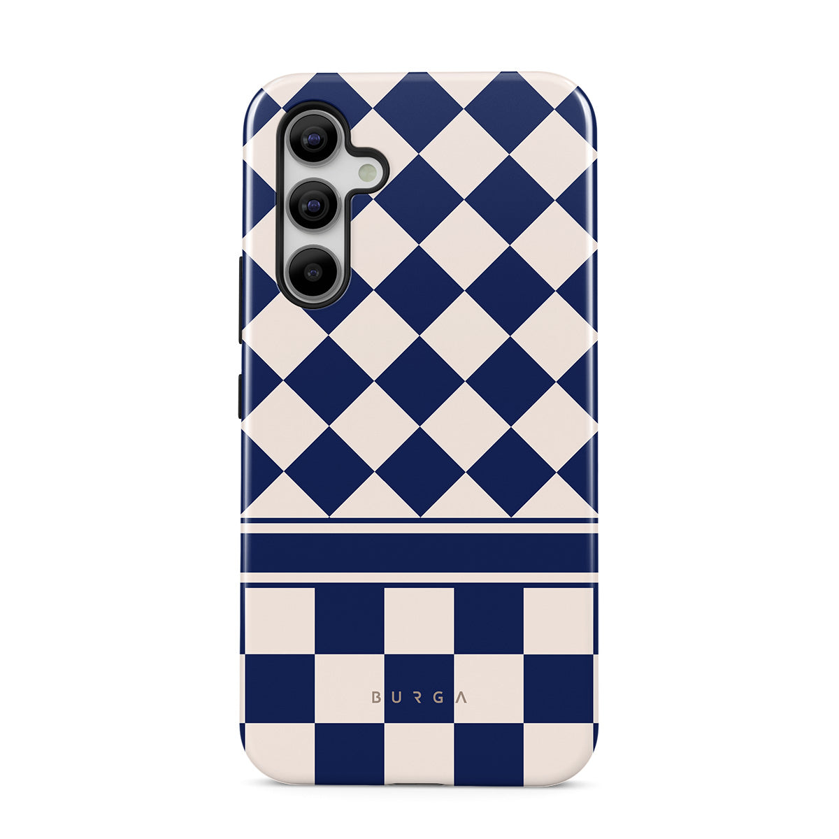 Embrace the essence of subtle luxury with our Check & Mate Samsung Galaxy A55 phone case design. Blending eggshell and deep blue checkers, it evokes whispers of elegance. While diamonds grace the upper half, the lower half features a timeless chessboard pattern.