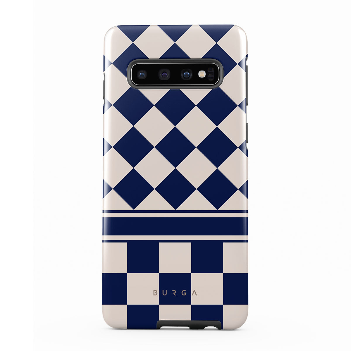 Embrace the essence of subtle luxury with our Check & Mate Samsung Galaxy S10 4G phone case design. Blending eggshell and deep blue checkers, it evokes whispers of elegance. While diamonds grace the upper half, the lower half features a timeless chessboard pattern.