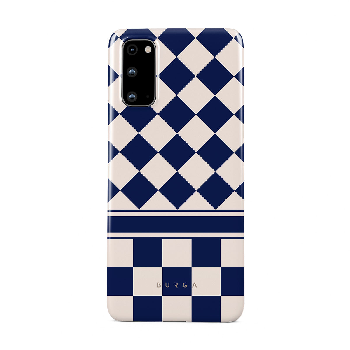 Embrace the essence of subtle luxury with our Check & Mate Samsung Galaxy S20 4G / 5G phone case design. Blending eggshell and deep blue checkers, it evokes whispers of elegance. While diamonds grace the upper half, the lower half features a timeless chessboard pattern.