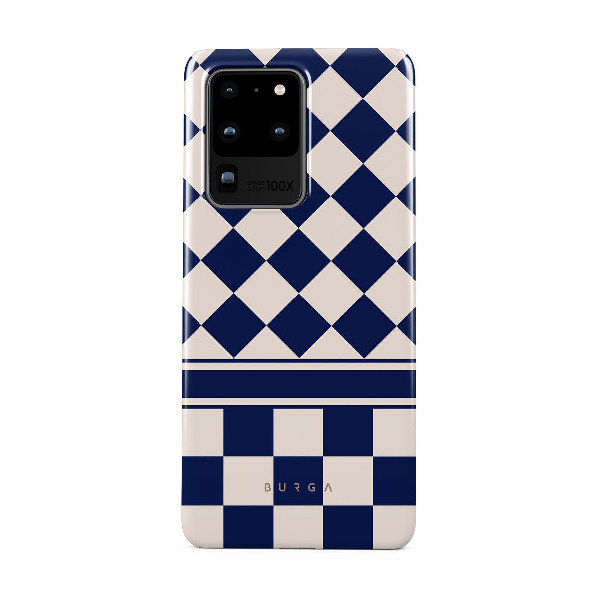 Embrace the essence of subtle luxury with our Check & Mate Samsung Galaxy S20 Ultra 4G / 5G phone case design. Blending eggshell and deep blue checkers, it evokes whispers of elegance. While diamonds grace the upper half, the lower half features a timeless chessboard pattern.