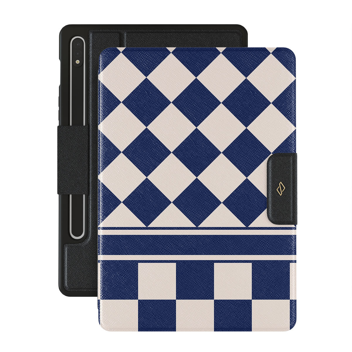 Embrace the essence of subtle luxury with our Check & Mate Samsung Galaxy Tab S9 FE folio case design. Blending eggshell and deep blue checkers, it evokes whispers of elegance. While diamonds grace the upper half, the lower half features a timeless chessboard pattern.