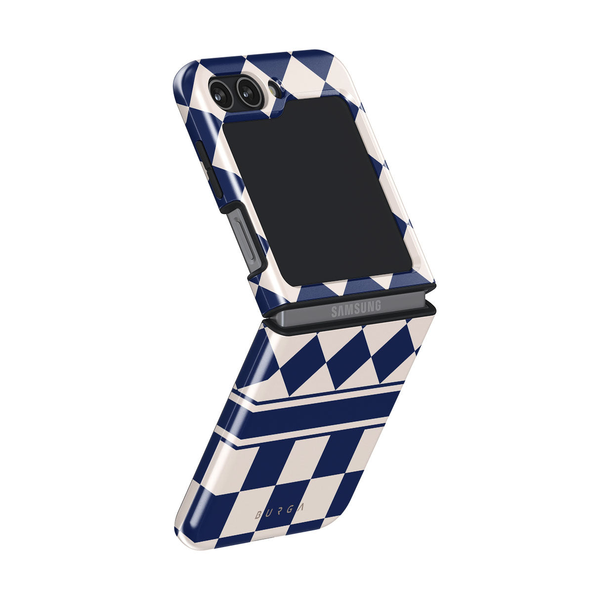 Embrace the essence of subtle luxury with our Check & Mate Samsung Galaxy Z Flip 5 phone case design. Blending eggshell and deep blue checkers, it evokes whispers of elegance. While diamonds grace the upper half, the lower half features a timeless chessboard pattern.