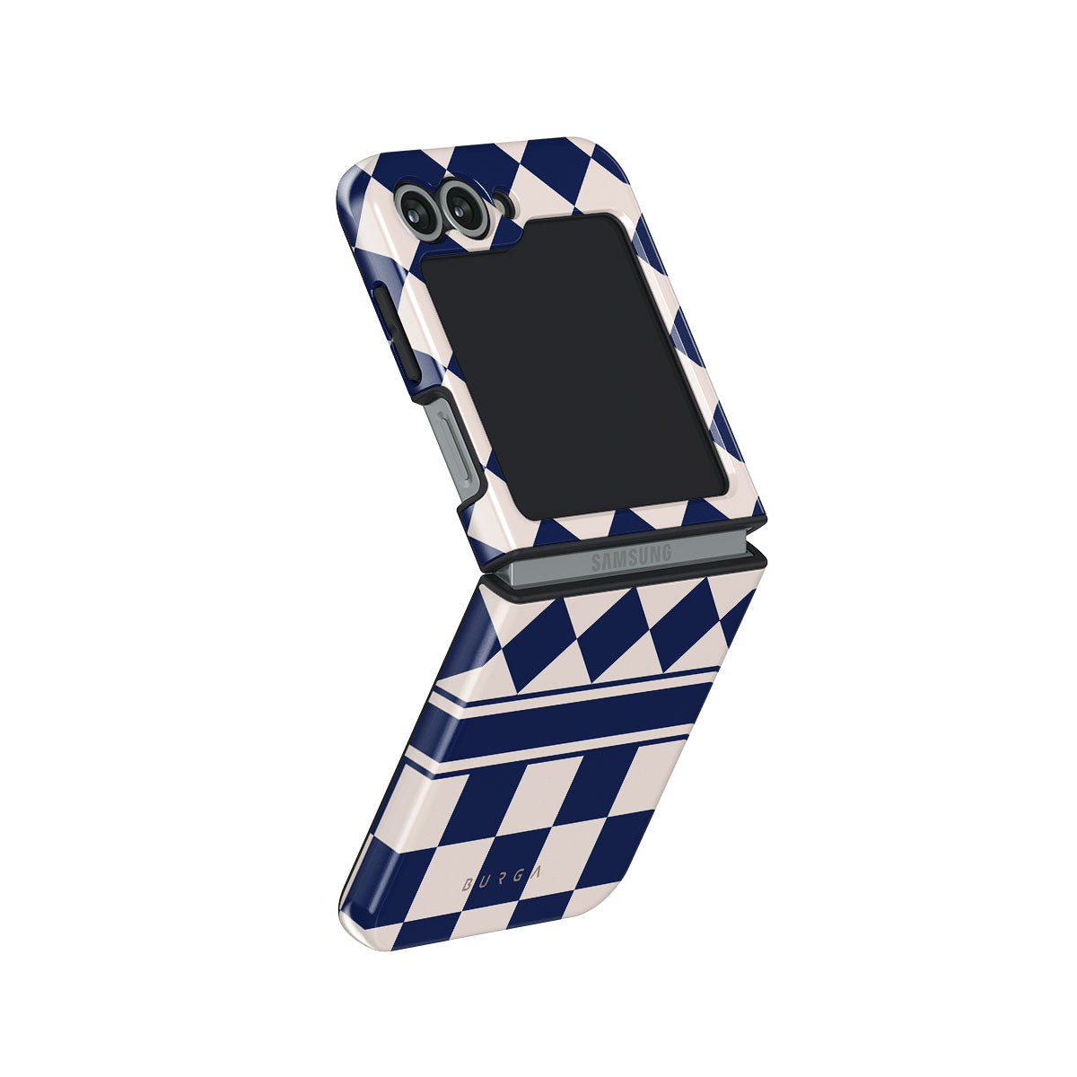 Embrace the essence of subtle luxury with our Check & Mate Samsung Galaxy Z Flip 6 phone case design. Blending eggshell and deep blue checkers, it evokes whispers of elegance. While diamonds grace the upper half, the lower half features a timeless chessboard pattern.