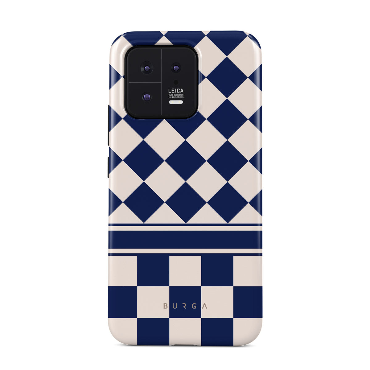 Embrace the essence of subtle luxury with our Check & Mate Xiaomi 13 phone case design. Blending eggshell and deep blue checkers, it evokes whispers of elegance. While diamonds grace the upper half, the lower half features a timeless chessboard pattern.