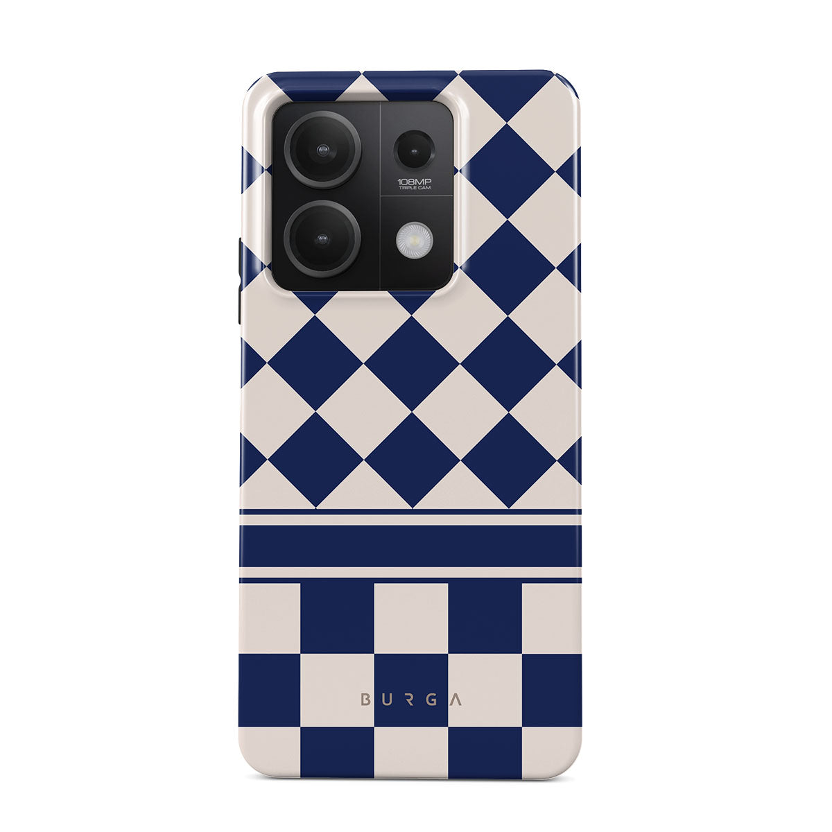 Embrace the essence of subtle luxury with our Check & Mate Xiaomi Redmi Note 13 5G phone case design. Blending eggshell and deep blue checkers, it evokes whispers of elegance. While diamonds grace the upper half, the lower half features a timeless chessboard pattern.