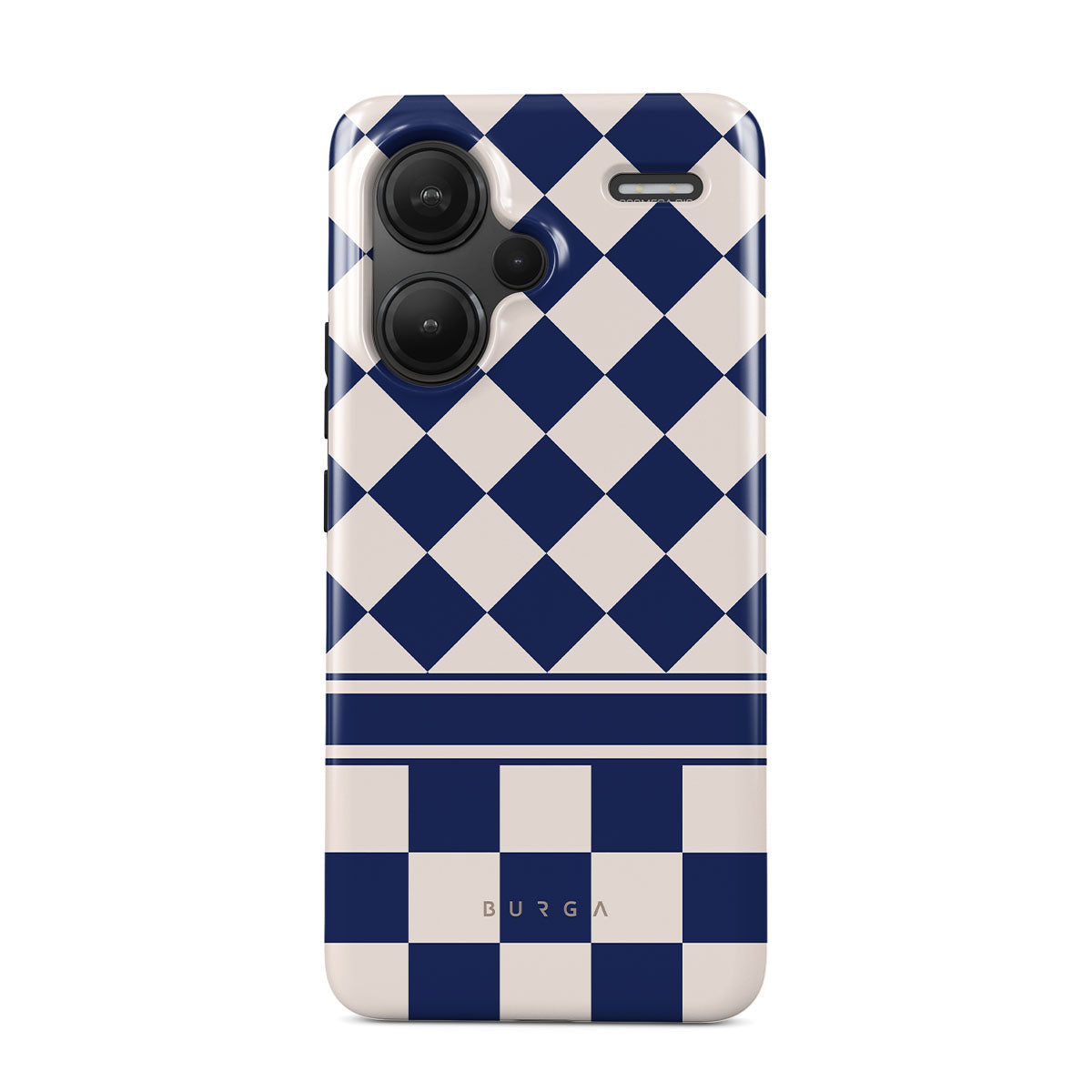 Embrace the essence of subtle luxury with our Check & Mate Xiaomi Redmi Note 13 Pro+ 5G phone case design. Blending eggshell and deep blue checkers, it evokes whispers of elegance. While diamonds grace the upper half, the lower half features a timeless chessboard pattern.