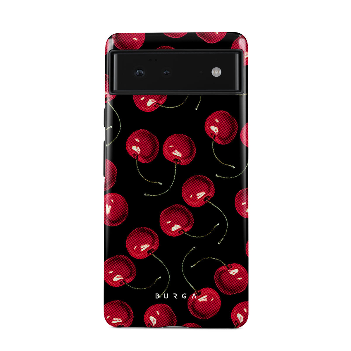 On a deep black background, rich red cherries stand out. Tempting and audacious, our Cherrybomb Google Pixel 6a phone case design is perfect for anyone who likes to keep things simple yet striking.
