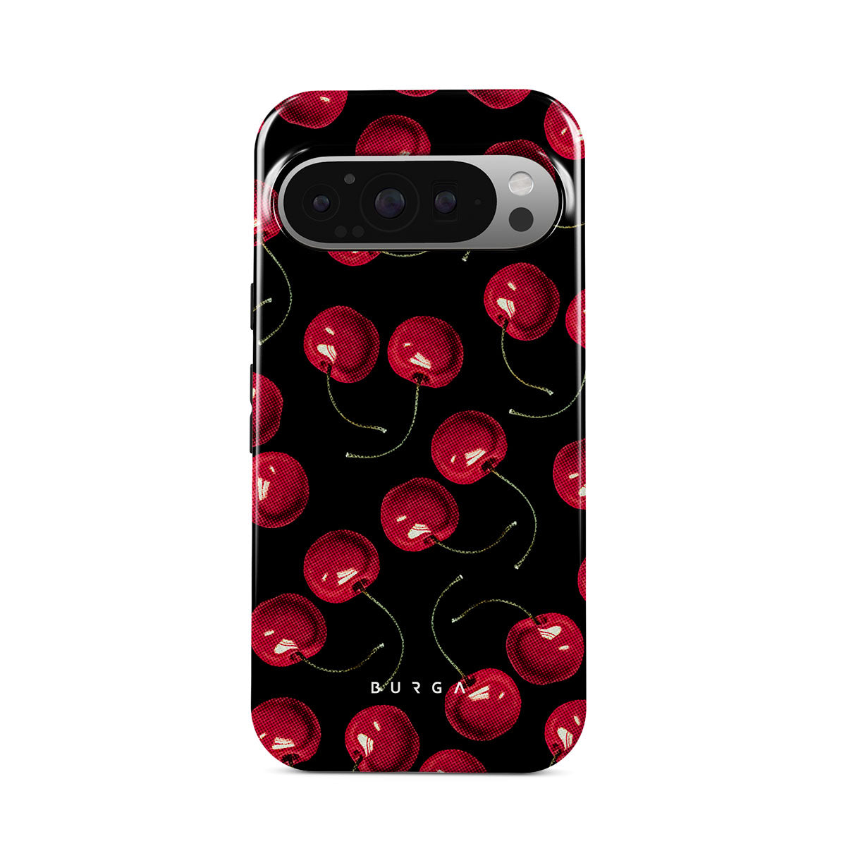 On a deep black background, rich red cherries stand out. Tempting and audacious, our Cherrybomb Google Pixel 9 Pro phone case design is perfect for anyone who likes to keep things simple yet striking.