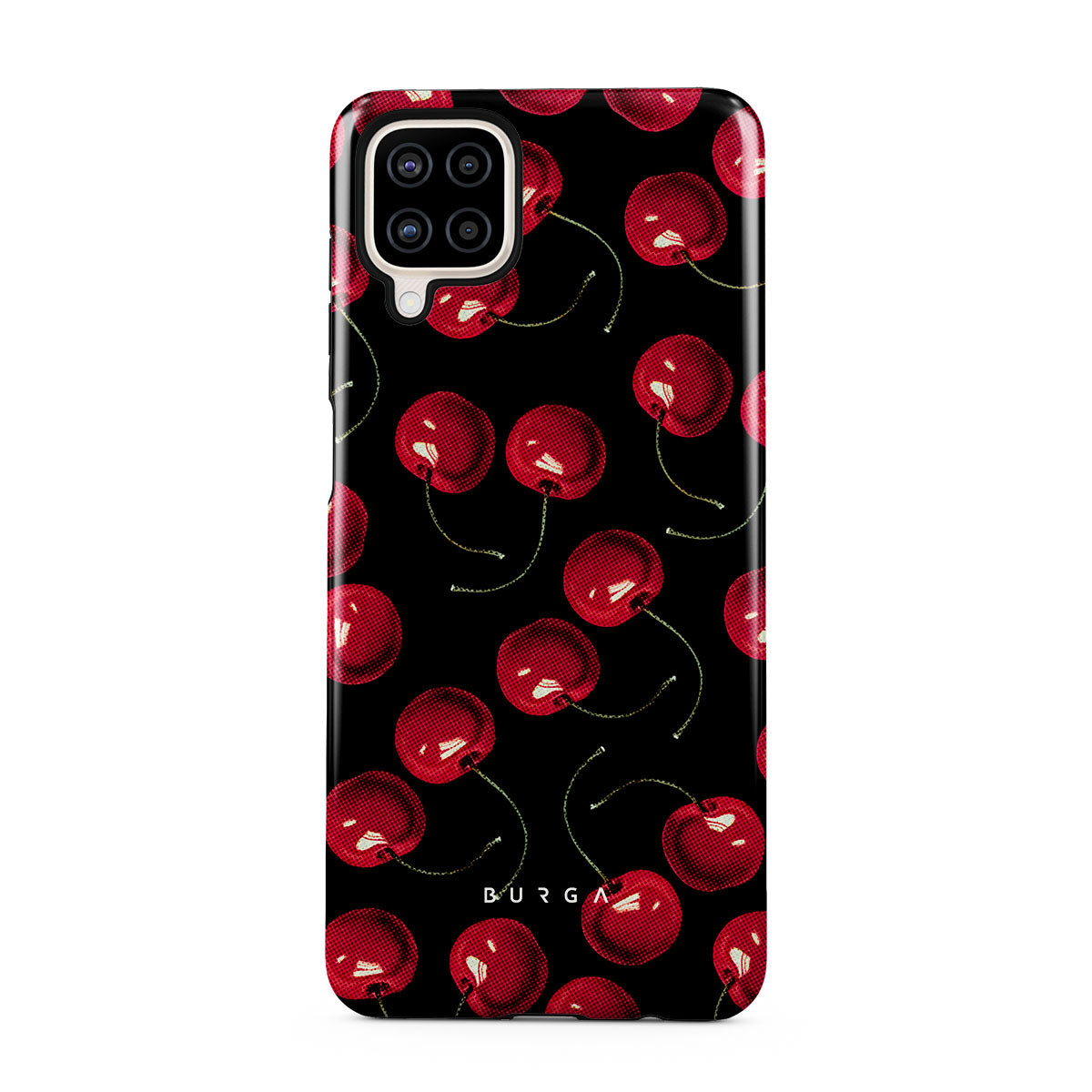 On a deep black background, rich red cherries stand out. Tempting and audacious, our Cherrybomb Samsung Galaxy A12 4G phone case design is perfect for anyone who likes to keep things simple yet striking.