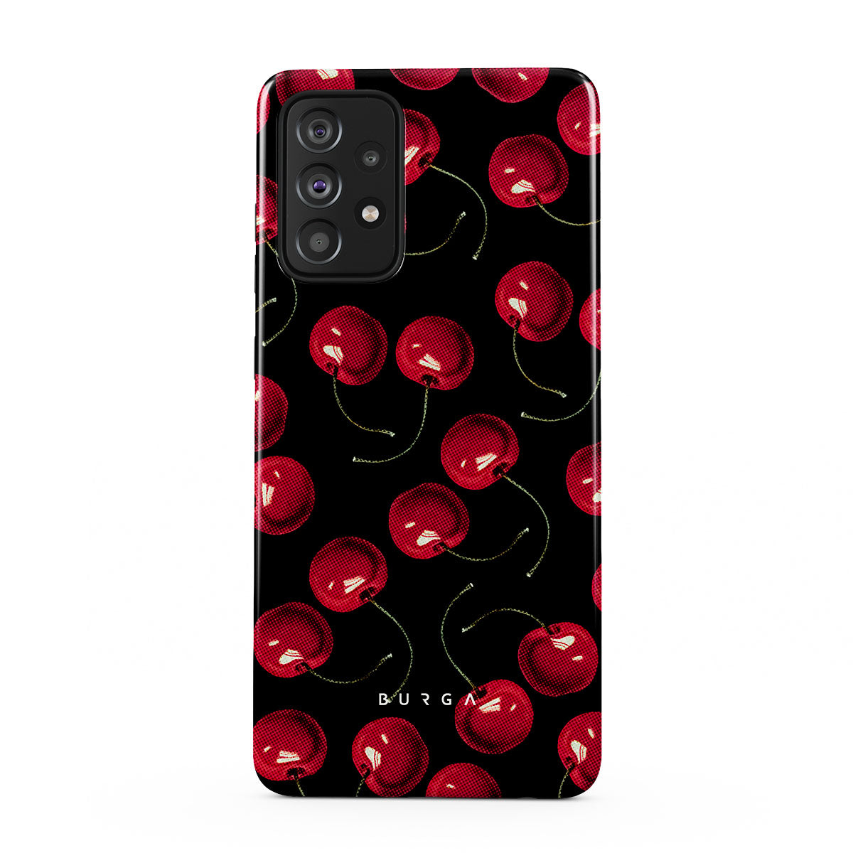 On a deep black background, rich red cherries stand out. Tempting and audacious, our Cherrybomb Samsung Galaxy A52 / A52S 4G / 5G phone case design is perfect for anyone who likes to keep things simple yet striking.