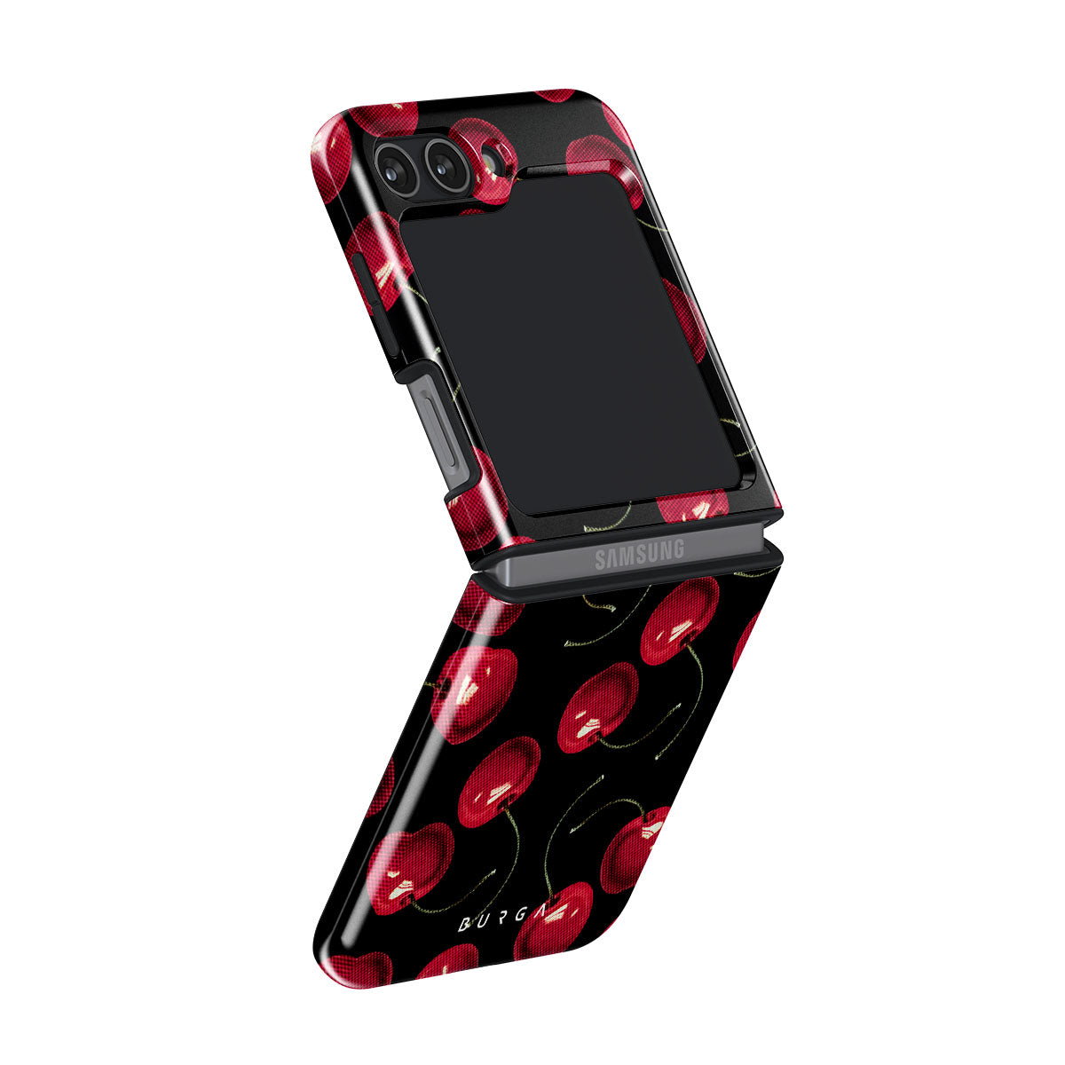 On a deep black background, rich red cherries stand out. Tempting and audacious, our Cherrybomb Samsung Galaxy Z Flip 5 phone case design is perfect for anyone who likes to keep things simple yet striking.