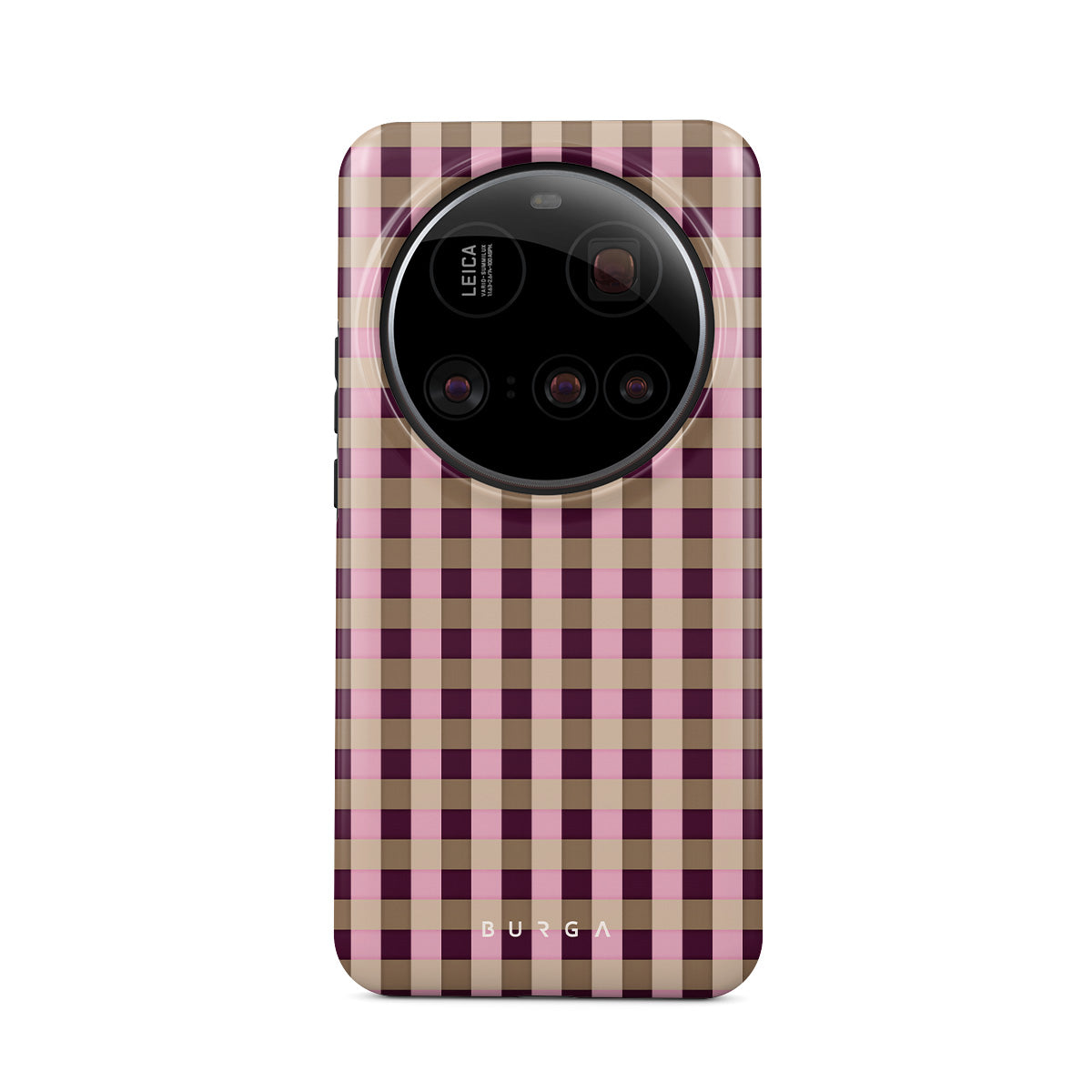 This design features: pink and burgundy plaid pattern, modern checkered style.