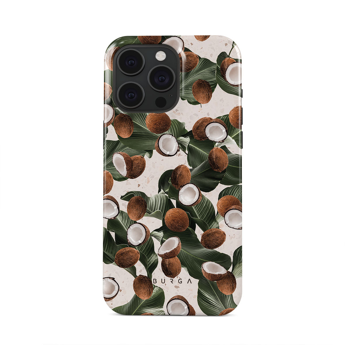 Coconut Crush iPhone 15 Pro phone case showcases a soft creme color design with a playful addition of coconuts on top. The unexpected design duo will add a touch of tropical playfulness to your style while offering heavy-duty protection for your cell phone.