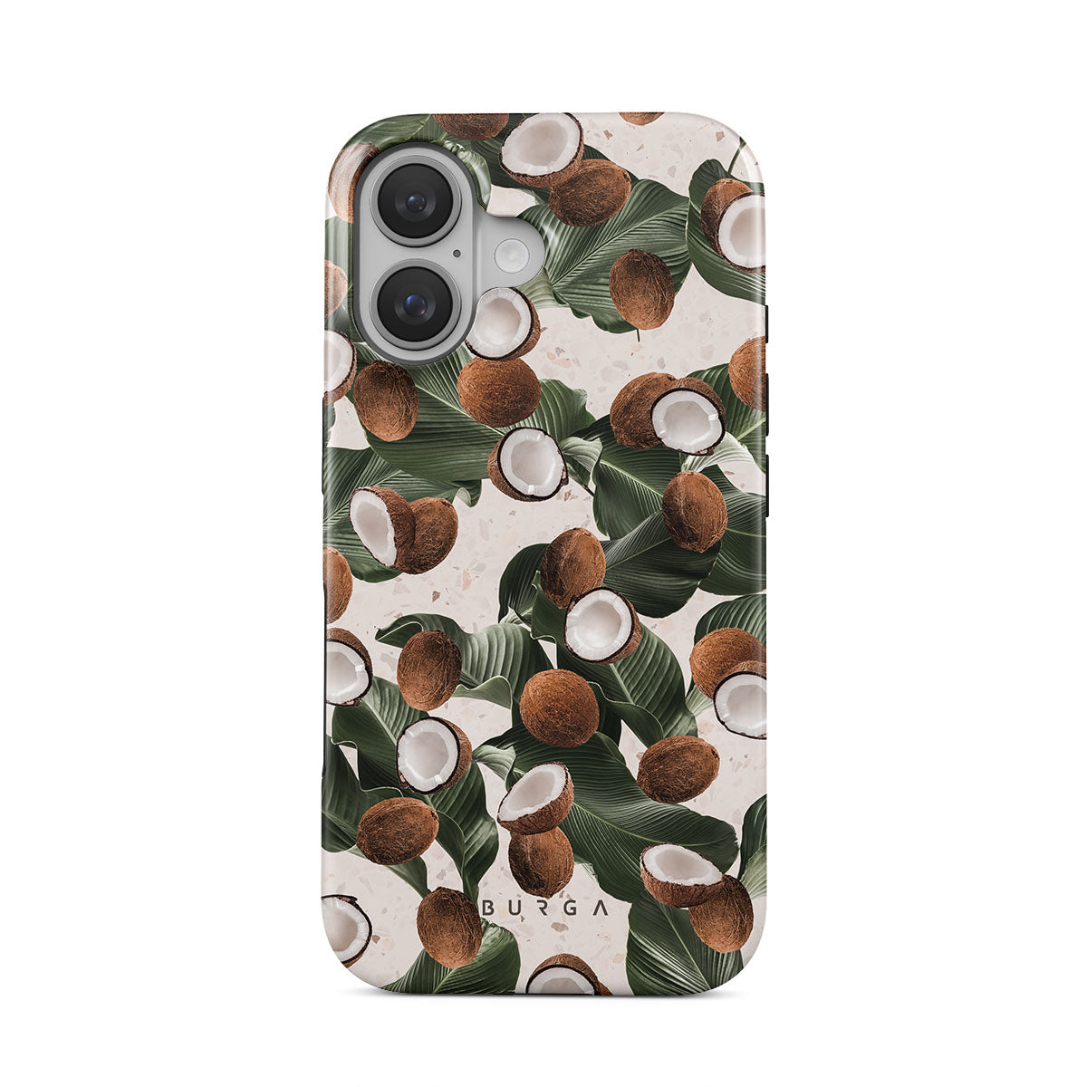 Coconut Crush iPhone 16 phone case showcases a soft creme color design with a playful addition of coconuts on top. The unexpected design duo will add a touch of tropical playfulness to your style while offering heavy-duty protection for your cell phone.
