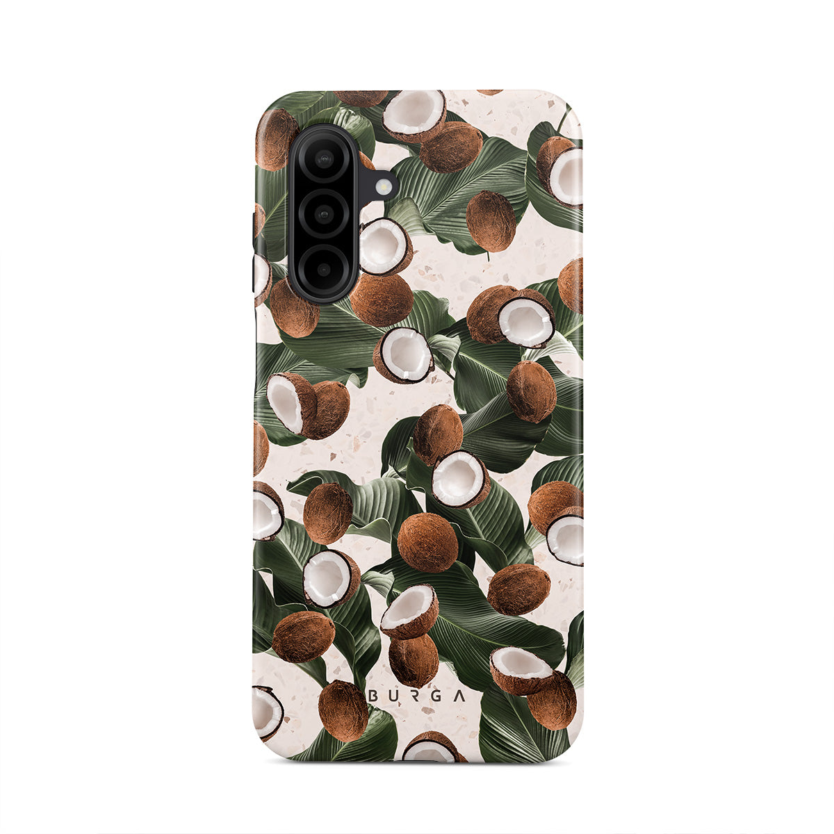 Coconut Crush Samsung Galaxy A26 5G phone case showcases a soft creme color design with a playful addition of coconuts on top. The unexpected design duo will add a touch of tropical playfulness to your style while offering heavy-duty protection for your cell phone.