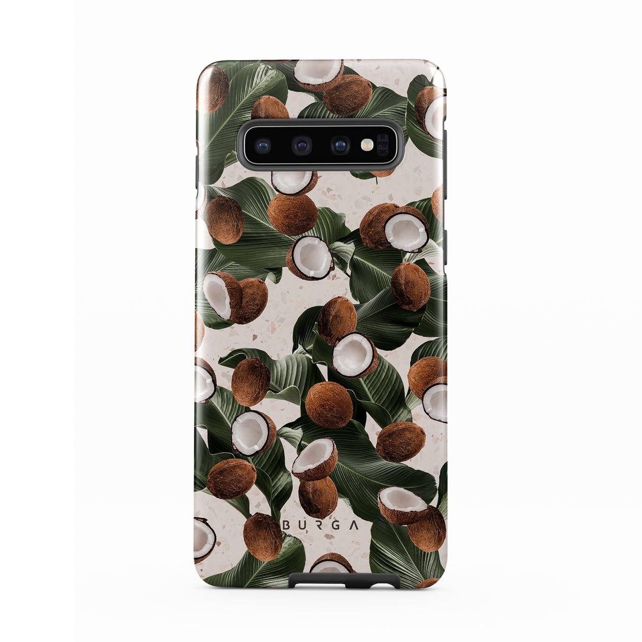 Coconut Crush Samsung Galaxy S10 phone case showcases a soft creme color design with a playful addition of coconuts on top. The unexpected design duo will add a touch of tropical playfulness to your style while offering heavy-duty protection for your cell phone.