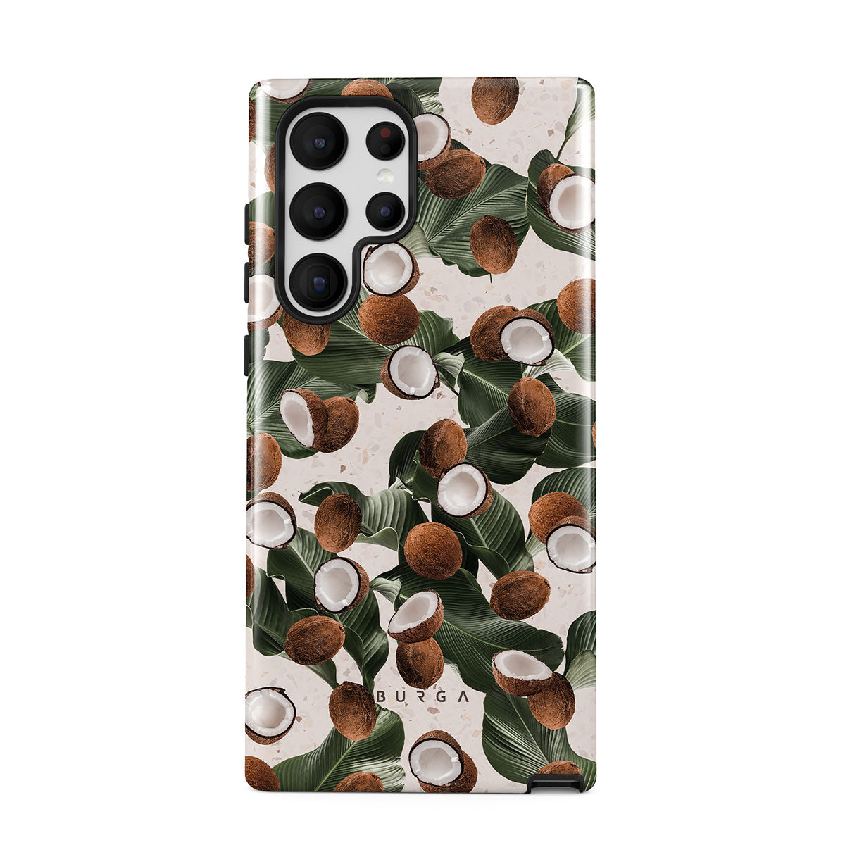 Coconut Crush Samsung Galaxy S22 Ultra phone case showcases a soft creme color design with a playful addition of coconuts on top. The unexpected design duo will add a touch of tropical playfulness to your style while offering heavy-duty protection for your cell phone.