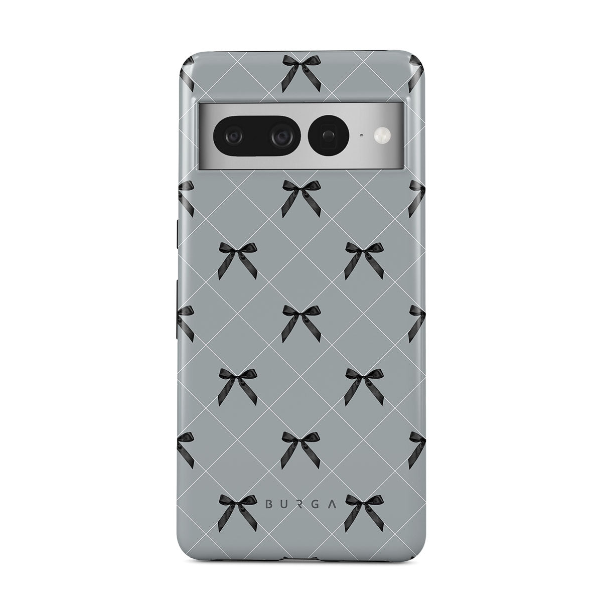 A subtle hint to a world of dance and soft melodies. Crisscrossing bows over a muted gray tone capture the flirtatious essence of the coquette-core aesthetic. Playful and sweet, our Coquette Google Pixel 7 Pro phone case design is perfect for those who find beauty in the details.