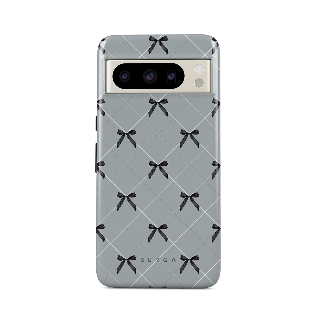 A subtle hint to a world of dance and soft melodies. Crisscrossing bows over a muted gray tone capture the flirtatious essence of the coquette-core aesthetic. Playful and sweet, our Coquette Google Pixel 8 Pro phone case design is perfect for those who find beauty in the details.