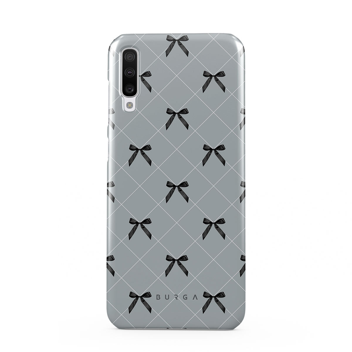 A subtle hint to a world of dance and soft melodies. Crisscrossing bows over a muted gray tone capture the flirtatious essence of the coquette-core aesthetic. Playful and sweet, our Coquette Samsung Galaxy A70 phone case design is perfect for those who find beauty in the details.