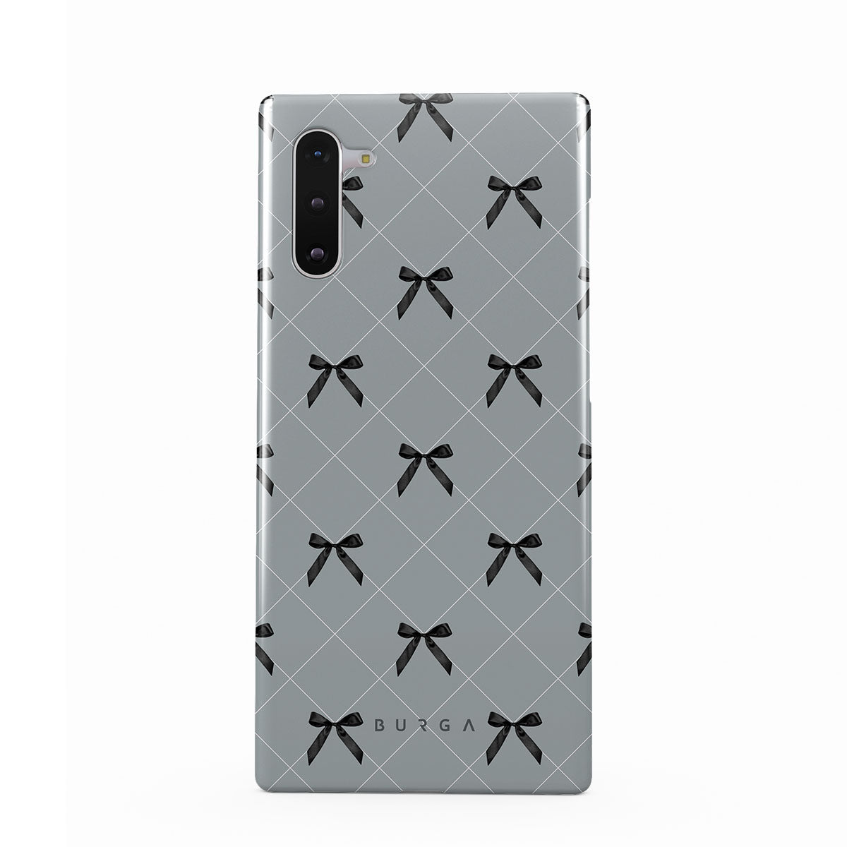 A subtle hint to a world of dance and soft melodies. Crisscrossing bows over a muted gray tone capture the flirtatious essence of the coquette-core aesthetic. Playful and sweet, our Coquette Samsung Galaxy Note 10 phone case design is perfect for those who find beauty in the details.