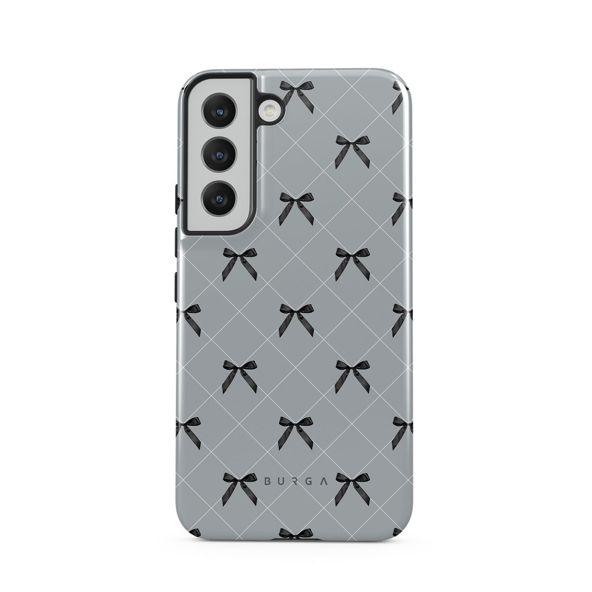 A subtle hint to a world of dance and soft melodies. Crisscrossing bows over a muted gray tone capture the flirtatious essence of the coquette-core aesthetic. Playful and sweet, our Coquette Samsung Galaxy S22 phone case design is perfect for those who find beauty in the details.