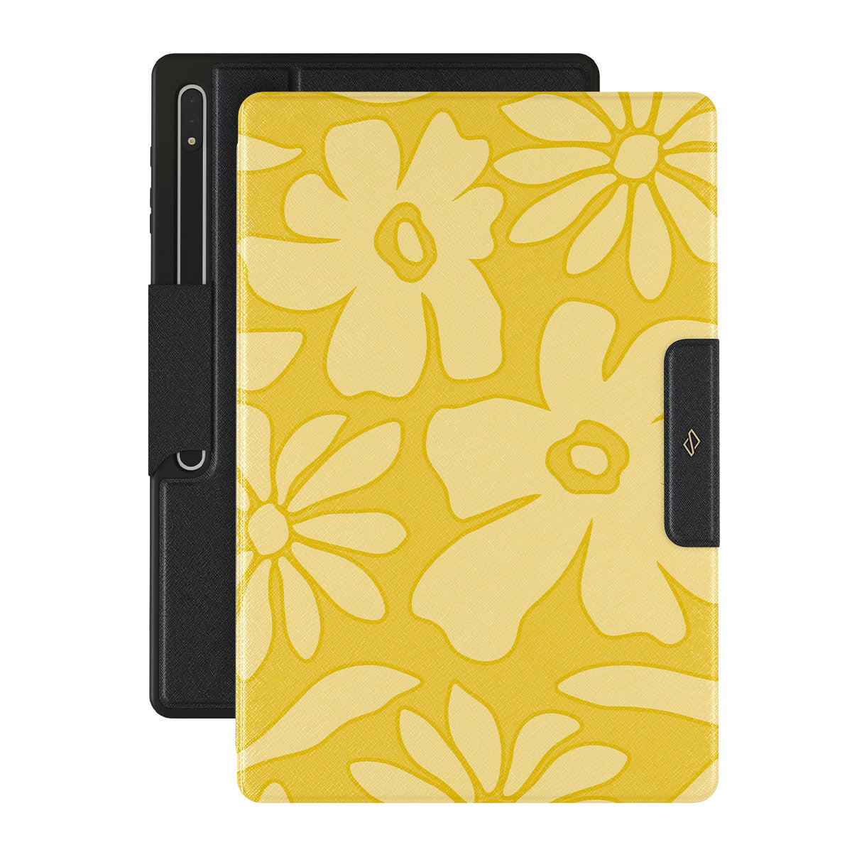 Our bright yellow Samsung Galaxy Tab S8 Ultra folio case features bold, beautiful flowers that evoke a sense of nostalgia and happiness. This cheerful floral design captures the essence of joyful moments, making your device a reminder of sunny memories. Perfect for brightening up your day.
