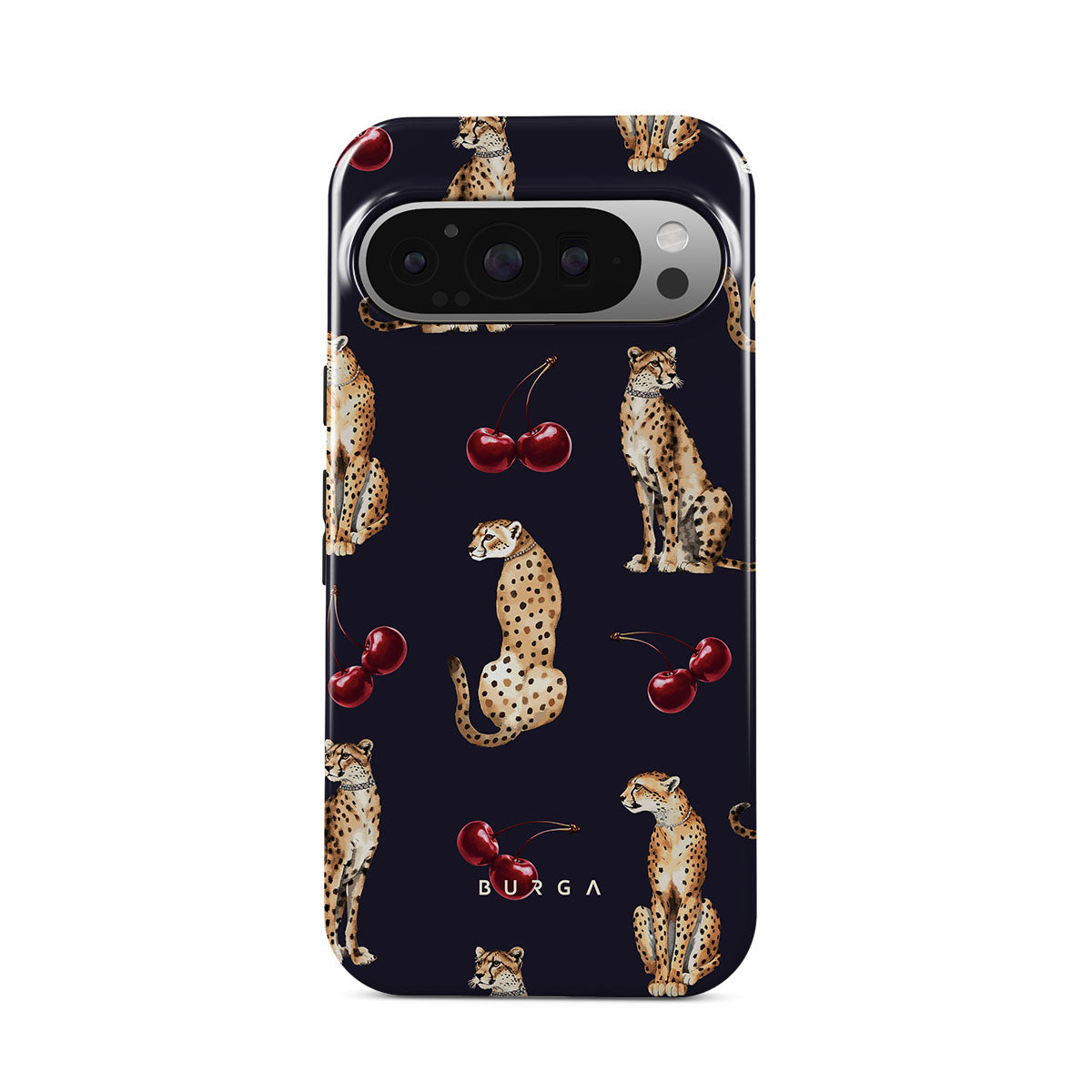 This design features: cheetah patterns, cheetahs, cherries