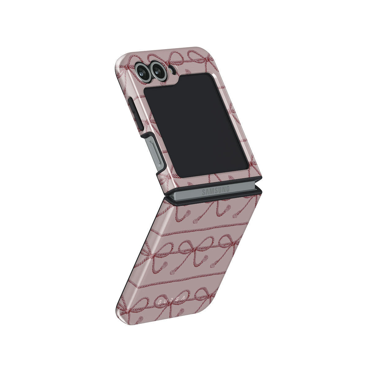 This design features: pink bows, pink background, ropes, playful pattern.