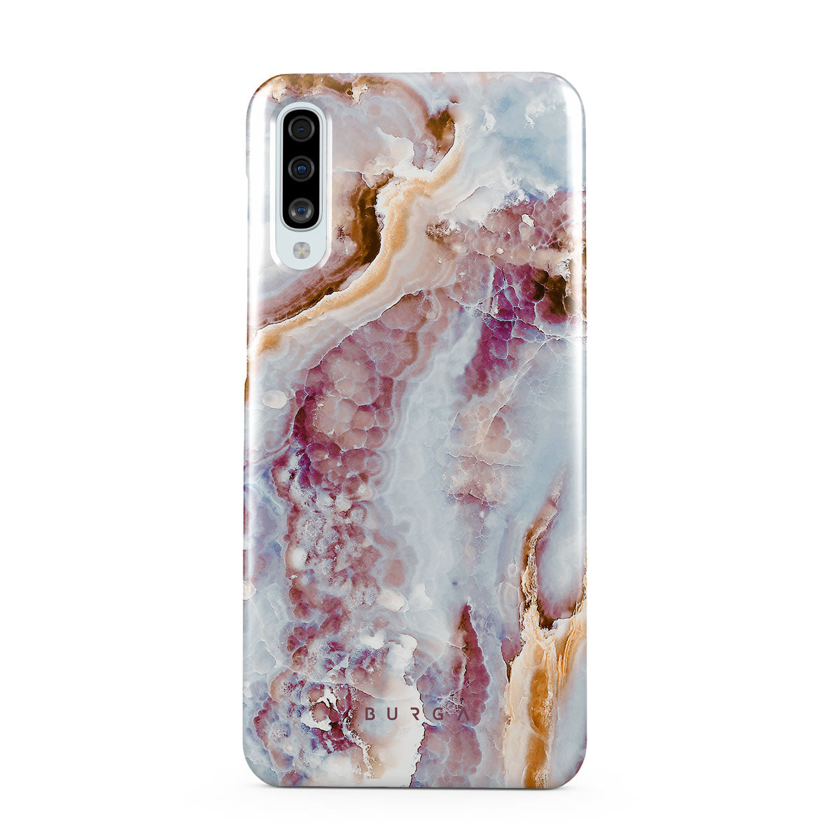 What frost can create on the surfaces is perfectly imperfect. The cute marble pattern of our hard-shell Samsung Galaxy A50 phone case inspired by the frozen leaves adds a splash of color in a dreamy blue background, becoming a beautiful part of anyone's style.