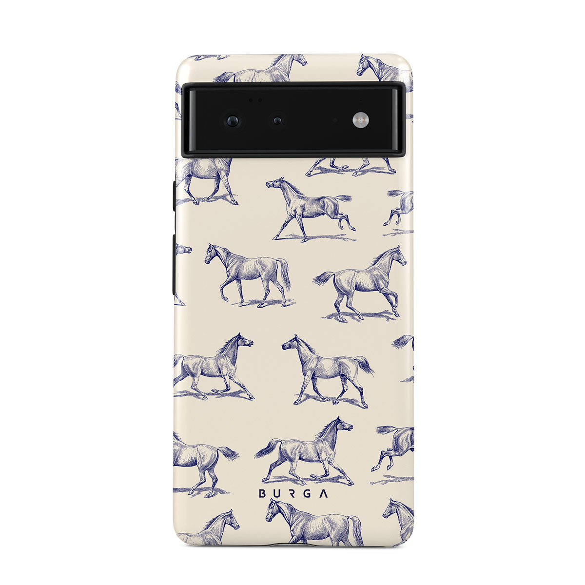 Introducing our Derby Race Google Pixel 6 phone case designa portrait of elegance in motion on a soft nude canvas. Engraved in delicate blue contours, galloping horses dance upon the wind, frozen in an exquisite moment of grace.