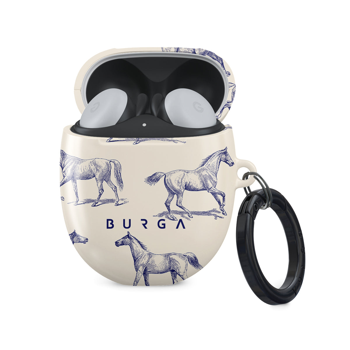 Introducing our Derby Race Google Pixel Buds 2 case cover designa portrait of elegance in motion on a soft nude canvas. Engraved in delicate blue contours, galloping horses dance upon the wind, frozen in an exquisite moment of grace.