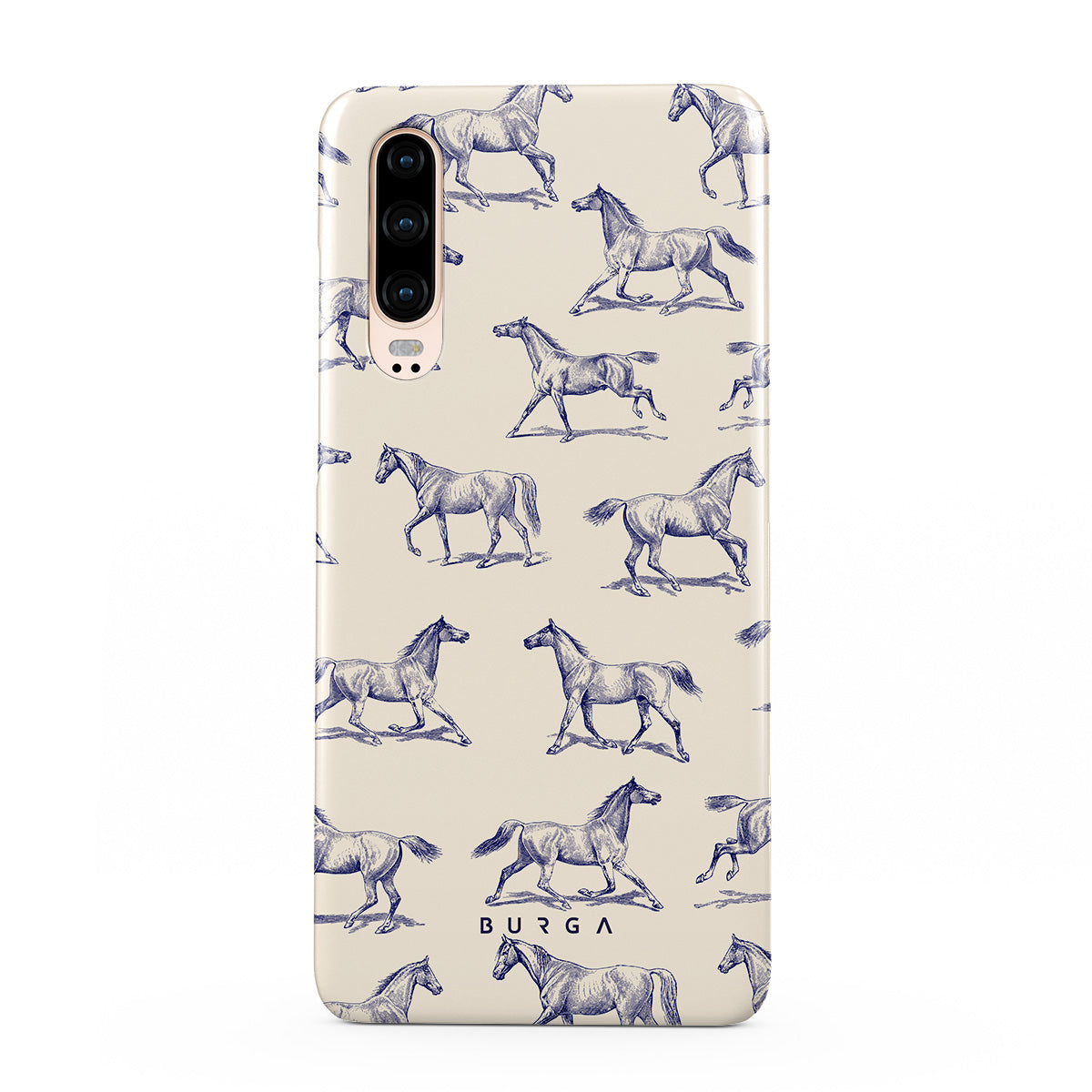 Introducing our Derby Race Huawei P30 phone case designa portrait of elegance in motion on a soft nude canvas. Engraved in delicate blue contours, galloping horses dance upon the wind, frozen in an exquisite moment of grace.