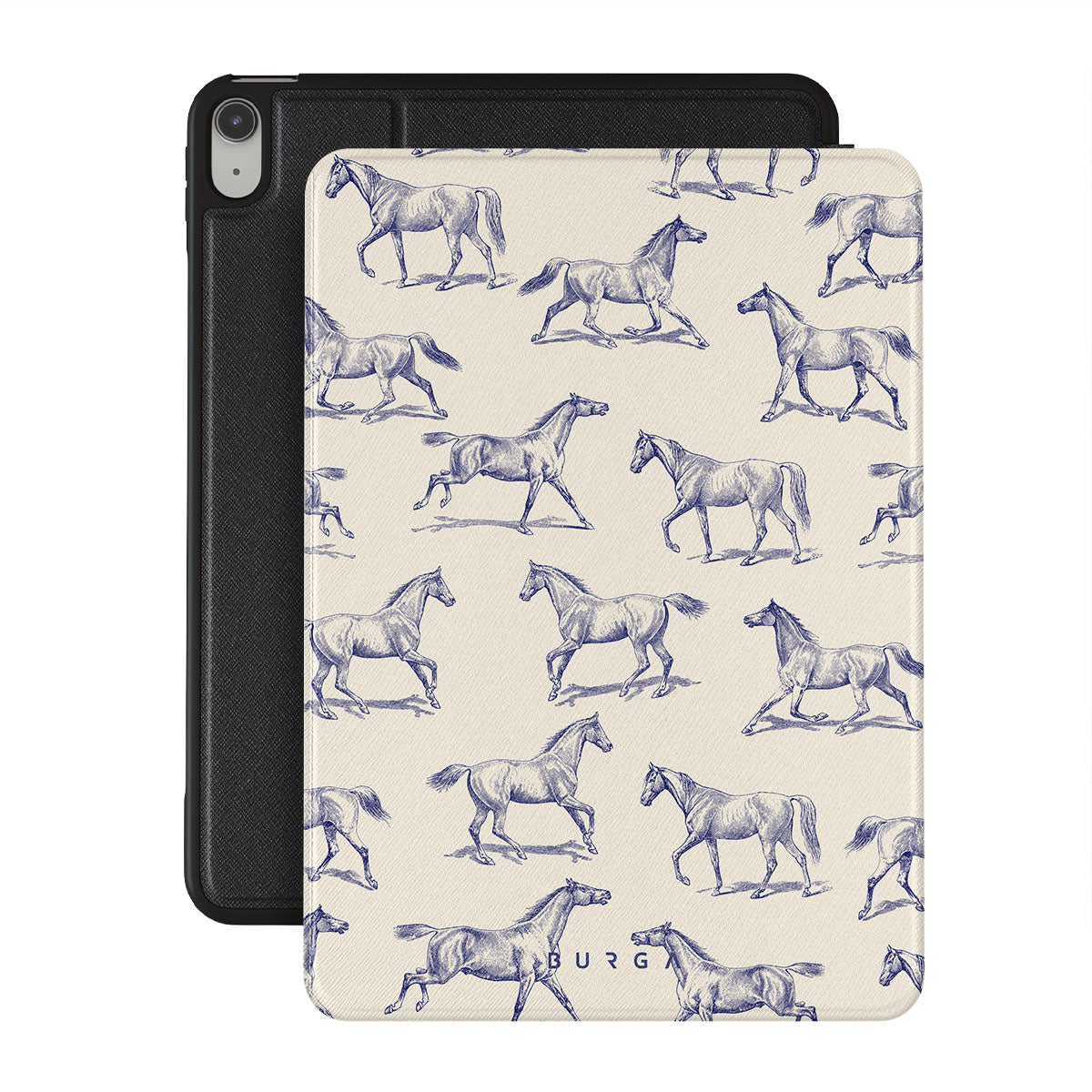 Introducing our Derby Race iPad 10.9 (A16/10th Gen) folio case designa portrait of elegance in motion on a soft nude canvas. Engraved in delicate blue contours, galloping horses dance upon the wind, frozen in an exquisite moment of grace.