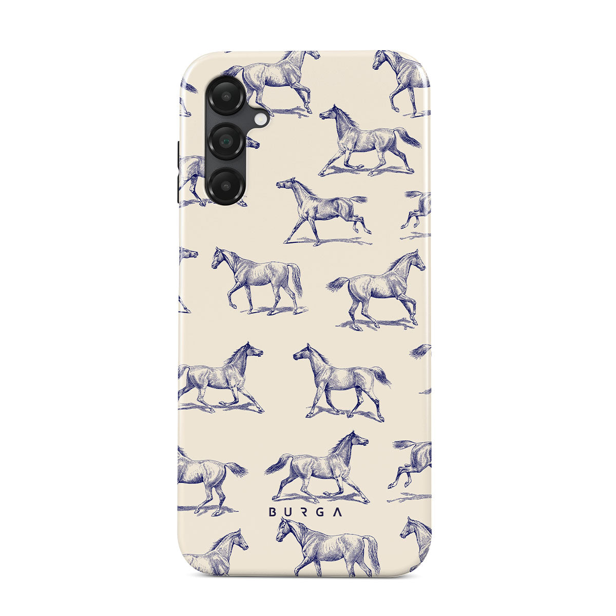 Introducing our Derby Race Samsung Galaxy A14 5G phone case designa portrait of elegance in motion on a soft nude canvas. Engraved in delicate blue contours, galloping horses dance upon the wind, frozen in an exquisite moment of grace.