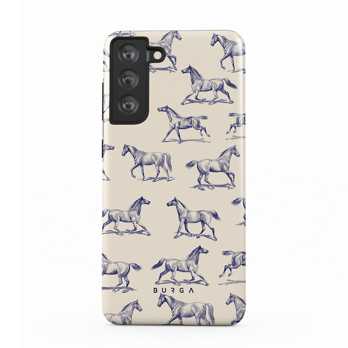 Introducing our Derby Race Samsung Galaxy S21 FE phone case designa portrait of elegance in motion on a soft nude canvas. Engraved in delicate blue contours, galloping horses dance upon the wind, frozen in an exquisite moment of grace.