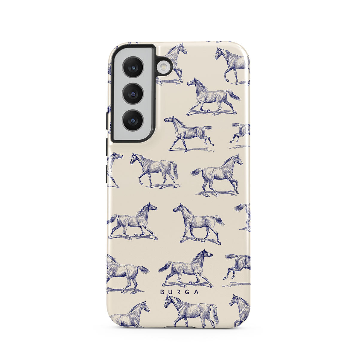 Introducing our Derby Race Samsung Galaxy S22 Plus phone case design—a portrait of elegance in motion on a soft nude canvas. Engraved in delicate blue contours, galloping horses dance upon the wind, frozen in an exquisite moment of grace.