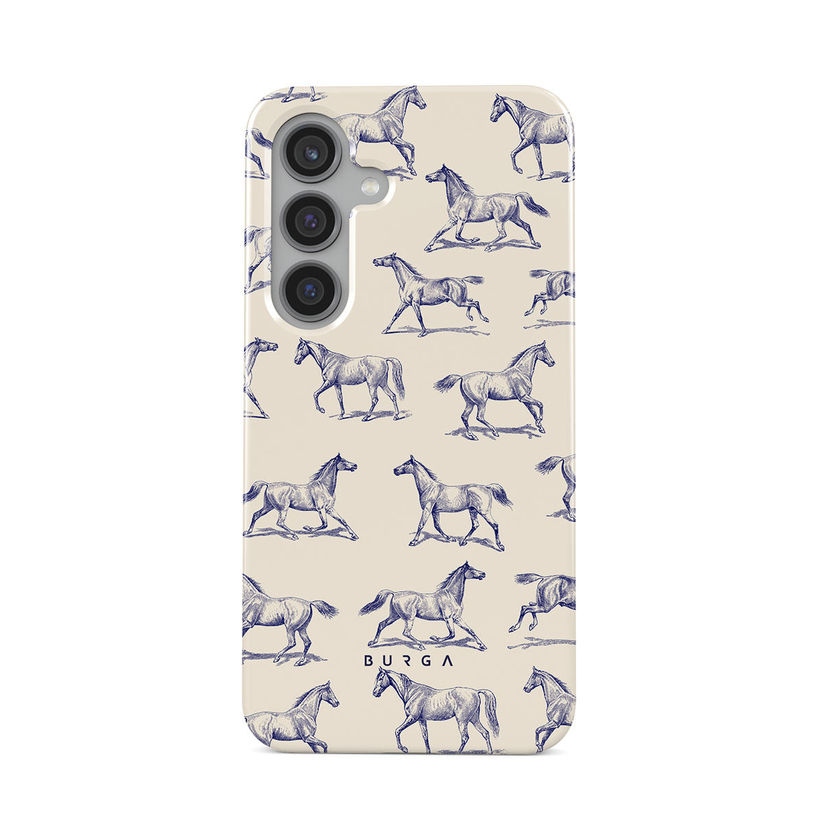 Introducing our Derby Race Samsung Galaxy S24 Plus phone case design—a portrait of elegance in motion on a soft nude canvas. Engraved in delicate blue contours, galloping horses dance upon the wind, frozen in an exquisite moment of grace.